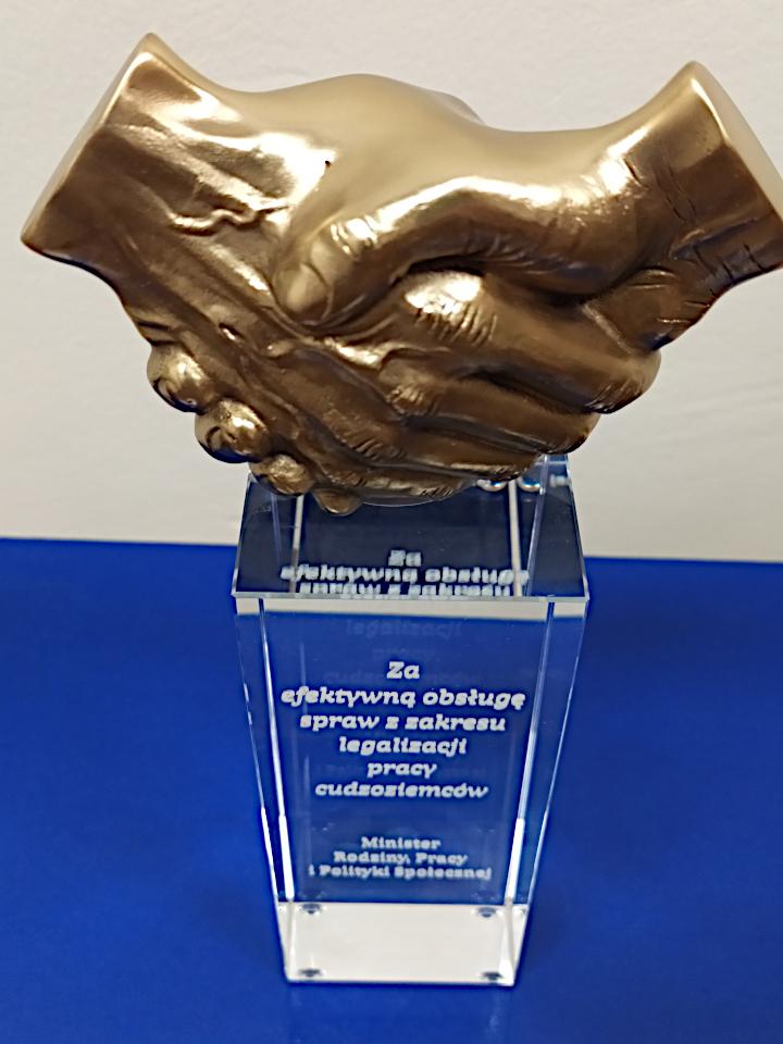 Zdjęcie przedstawia wyróżnienie dla Powiatowego Urzędu Pracy w Jarosławiu za efektywną i skuteczną obsługę spraw z zakresu legalizacji pracy cudzoziemców w roku 2019