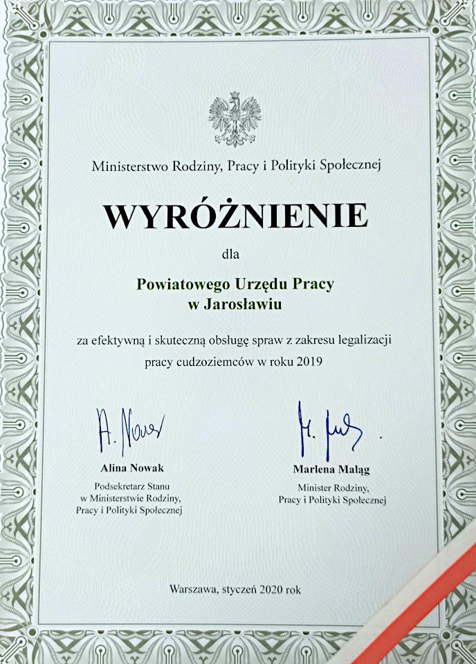 Wyróżnienie dla Powiatowego Urzędu Pracy w Jarosławiu za efektywną i skuteczną obsługę spraw z zakresu legalizacji pracy cudzoziemców w roku 2019